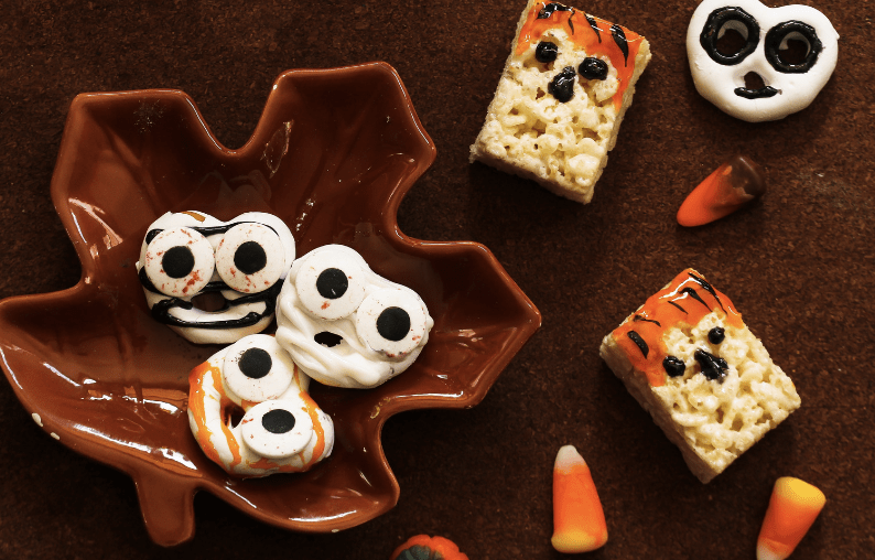 For a cute and spooky treat, make zombie Halloween Rice Krispie treats. Start by shaping Rice Krispie treats into small balls and inserting a popsicle stick into each one. Then, dip the treats into melted chocolate and decorate them with edible markers or icing to create zombie faces. These treats are not only adorable but also delicious and perfect for Halloween parties.