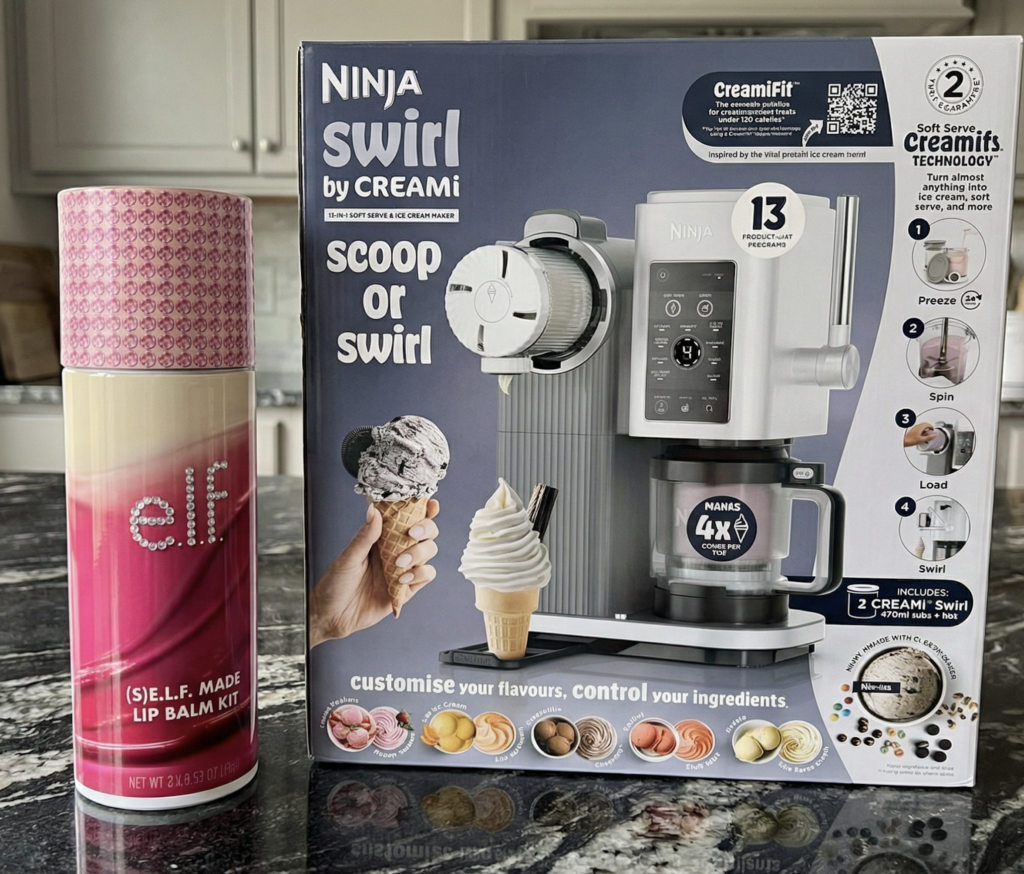 - 🍦 The Prize Package: One (1) Ninja SWIRL appliance in Platinum Silver, PLUS an e.l.f. (S)e.l.f. Made DIY Lip Balm Kit (Includes 3 Melting Lip Balms and custom gems). ARV: $260.