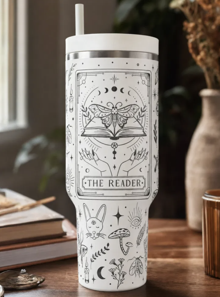 - “The Reader” Tarot Stanley Tumbler — a white Stanley tumbler with gothic tarot-style illustrations