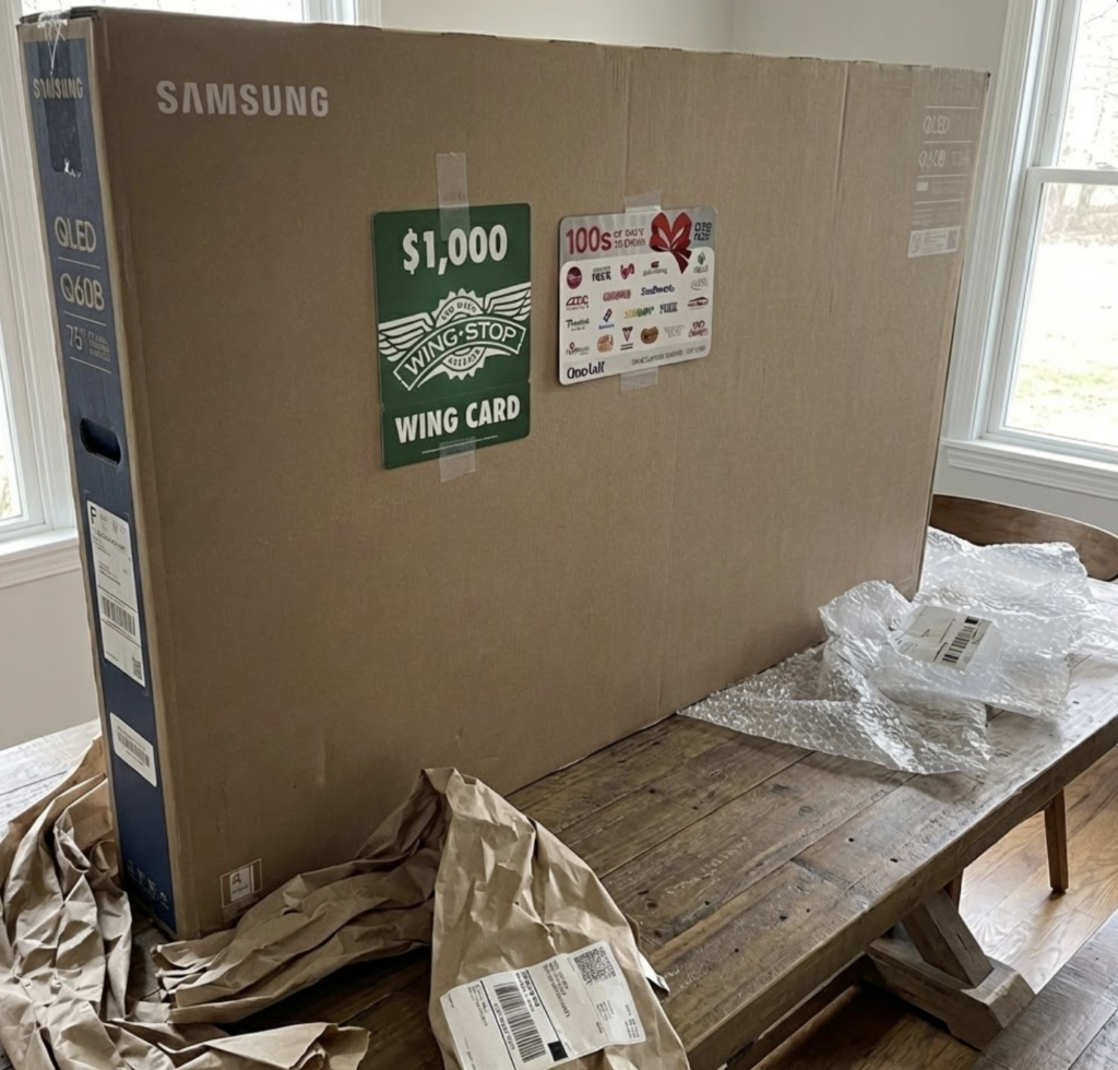 For the digital gift codes (Wingstop and food delivery), you’ll receive codes that you can use immediately. The 75-inch TV will be arranged for delivery to your address. The $1,000 cash will be sent via PayPal, so you’ll need a PayPal account to receive it (you can create a free account if you don’t have one).