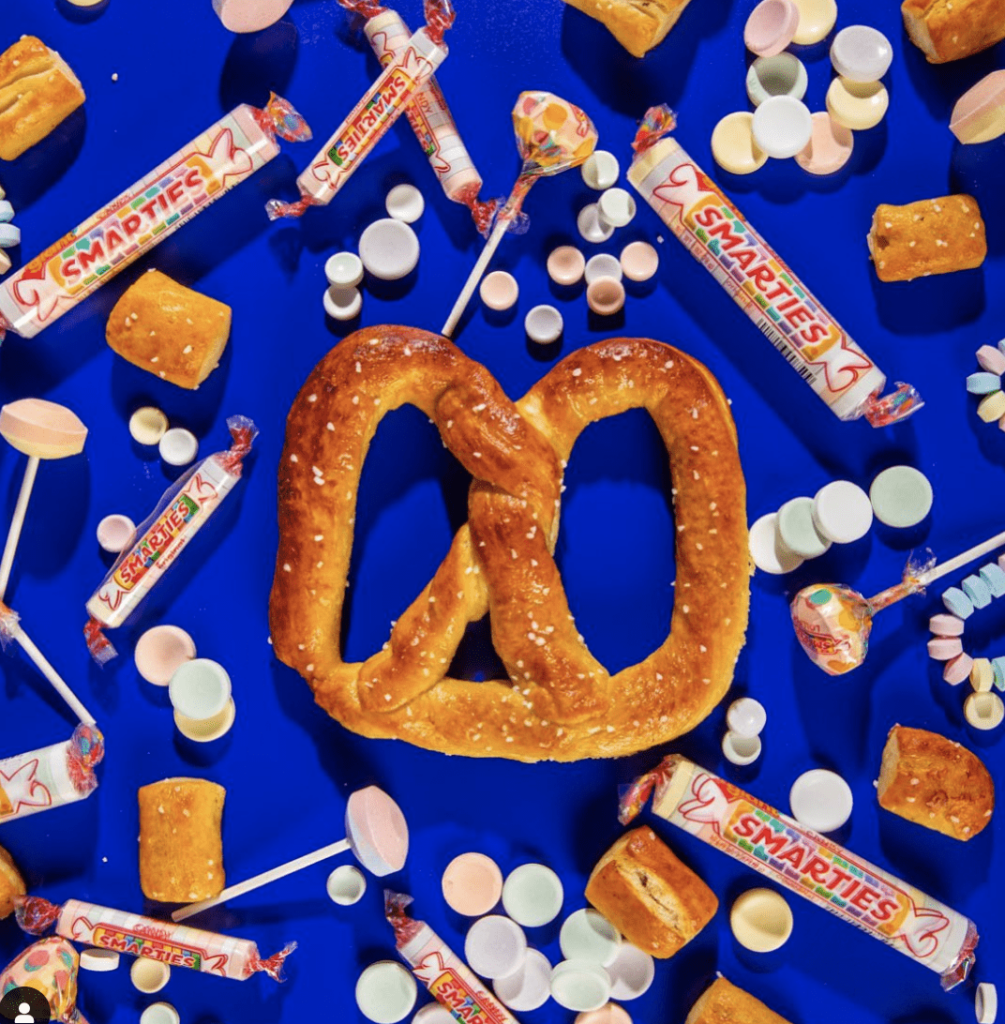 - Follow @auntieannespretzels and @smarties.