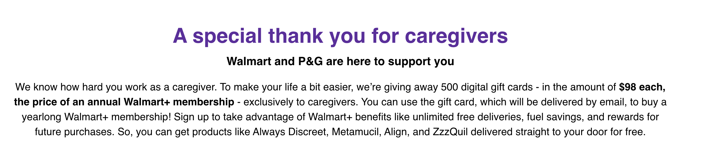 Freebies 5 Min Read Freebie Mom onJune 7, 2023 FREE Walmart Gift Card for Caregivers The P&G Caregivers Offer is a promotion sponsored by The Procter & Gamble Distributing LLC and administered by Realtime Media LLC. The…