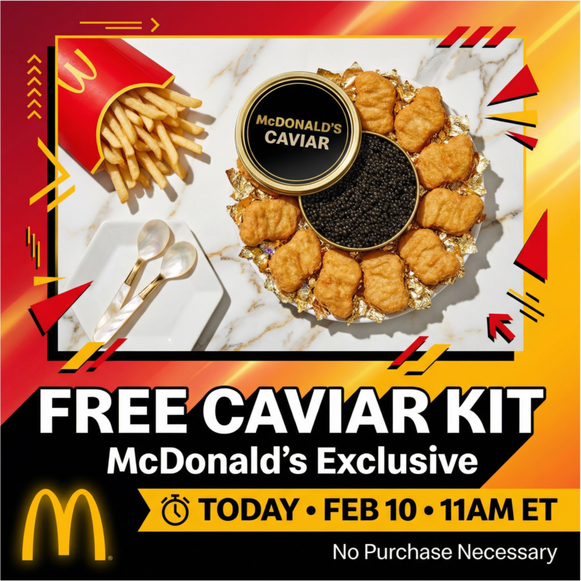 Freebies 1 Min Read Freebie Mom onFebruary 10, 2026 FREE McDonald’s McNugget Caviar Kits! Get Yours Before They’re Gone! Limited Edition Drop McNugget® Caviar The Pairing You Didn’t Know You Needed. Until Now. 00 Days 00 Hours 00 Mins 00 Secs Dropping…