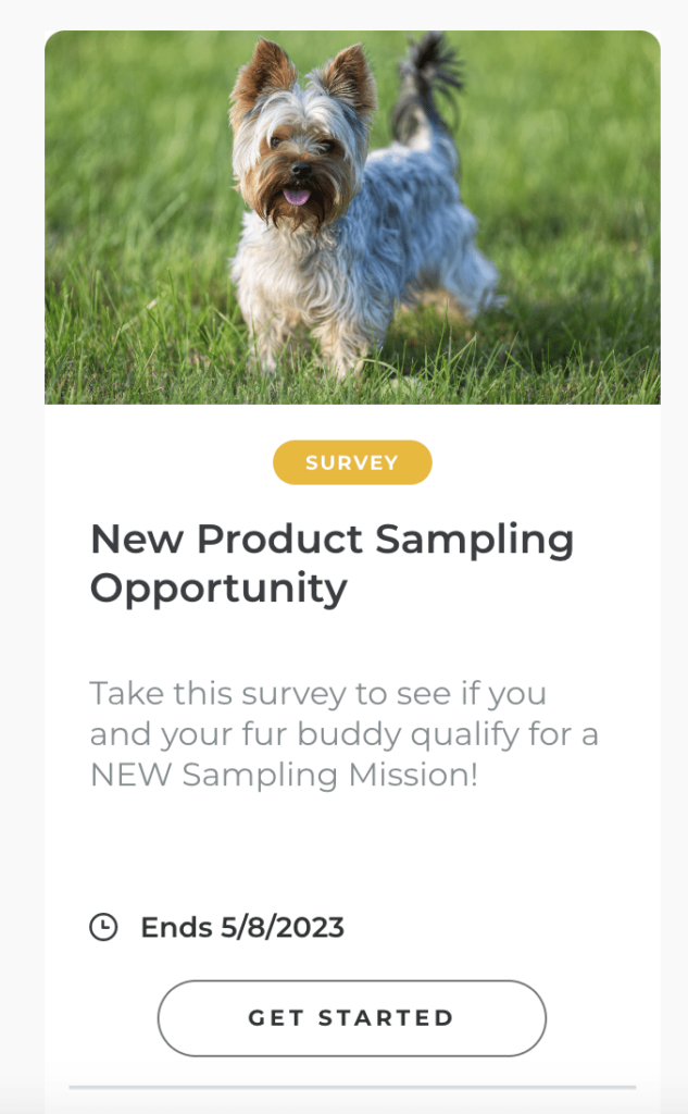 *If this is the first time using the site you will have to complete the welcome mission to answer questions about your pets. Go here and sign up for a free account and if you already have an account click here for the mission. MAKE SURE YOU HAVE TAKEN ALL THE SURVEYS ON YOUR DASHBOARD. Once it is all clear and you have no missions you should see a mission that mentions free samples. Click on the mission and answer the questions. At the end, they will tell you if you qualify and ask for your address.