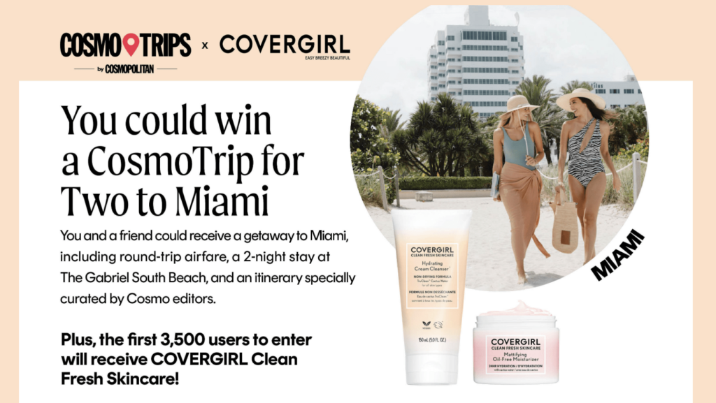 Don’t let this incredible opportunity slip away! The CosmoTrips x COVERGIRL Sweepstakes offers a chance to win a luxurious vacation to Miami, along with amazing prizes from COVERGIRL. Whether you’re dreaming of exploring the vibrant streets of Wynwood, indulging in delicious cuisine, or lounging on the beautiful beaches of Miami, this sweepstakes has it all. So, mark your calendars, get your entry ready, and brace yourself for a chance to create memories that will last a lifetime. Don’t miss out on this extraordinary opportunity – enter the CosmoTrips x COVERGIRL Sweepstakes today!