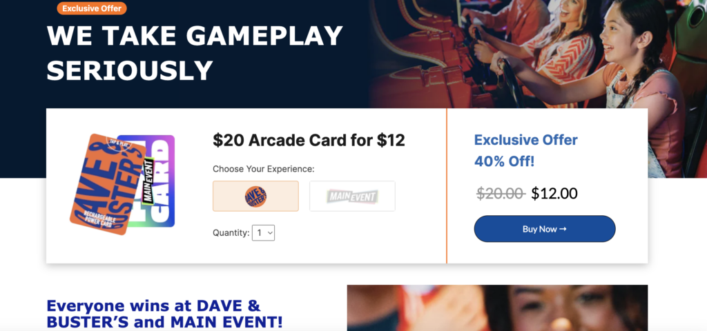 Once you’ve completed your purchase, you will receive a unique Arcade Credit barcode via email. Simply bring this barcode to the front desk of your local Dave & Buster’s or Main Event arcade to load your credit onto your Dave & Buster’s Power Card or Main Event Fun Card. It’s that easy!