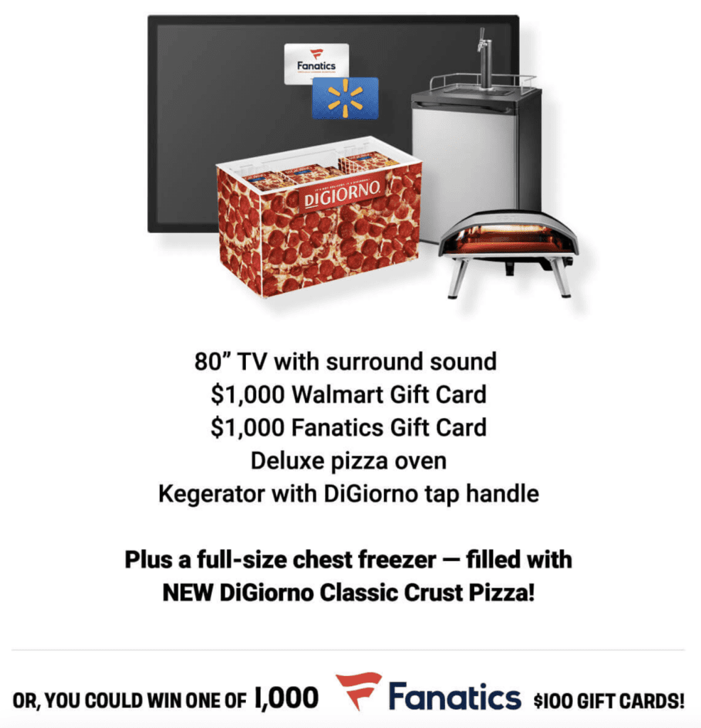 The DiGiorno Pizza Kickoff Sweepstakes is the perfect opportunity for pizza lovers and sweepstakes enthusiasts to win amazing prizes. With a grand prize worth over $12,000 and 1,000 first prizes of $100 Fanatics eGift Cards, there are plenty of chances to score big. So, mark your calendars and don’t miss out on this exciting sweepstakes! Enter today for your shot at winning the ultimate pizza party package and more. Good luck!