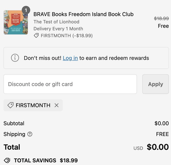 - Free First Month: Get your first book, The Test of Lionhood, for free with free shipping.