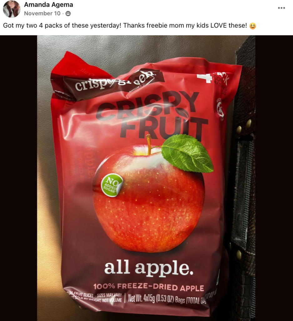 Big thanks to my follower Teala for sharing this offer with us! Don’t miss your chance to snag a free 4-pack of Crispy Fruit—click the link and share your healthy habits today!