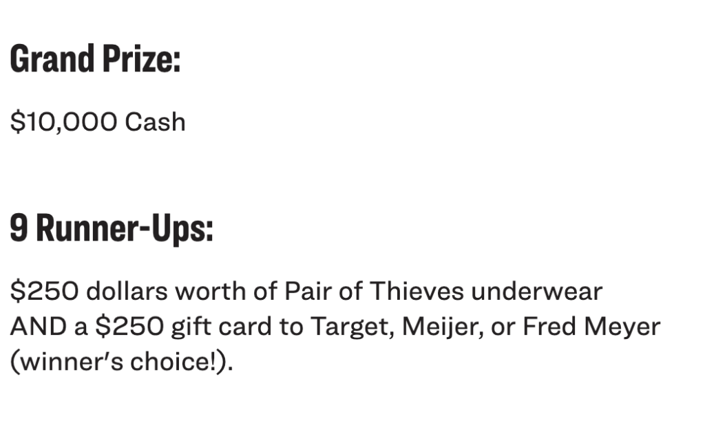 - Nine Weekly Winners: Each winner will receive $250 worth of Pair of Thieves Underwear and a $250 gift card to a retailer of their choice. These weekly prizes offer both comfort and convenience, ensuring you stay stylish and prepared.