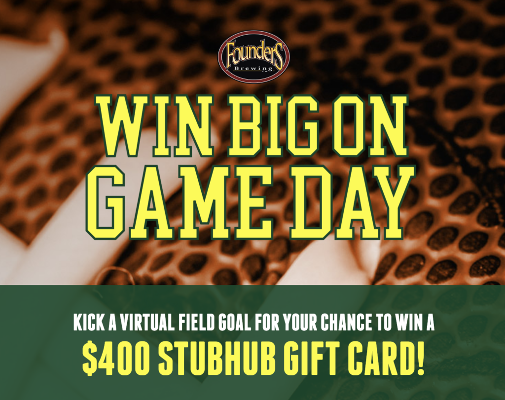 The Founders Brewing Win on Game Day Instant Win Promotion offers a total of eleven instant win prizes, each consisting of a $400 Stubhub.com gift card. These gift cards can be used to purchase tickets to your favorite events, making your game day experience even more memorable. The approximate retail value of each instant win prize is $400.