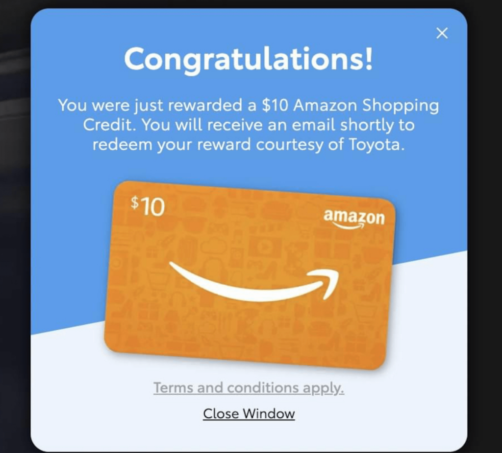 Want a free $10 Amazon Credit? Go here ( here is the link if you want to copy it into your browser : http://amazon.com/toyotaprius2023digitalsignage )Watch the Toyota Prius video on Amazon and get a FREE $10 Amazon Shopping Credit! After watching the clip, you may see a “Congratulations!” message. If you don’t see the message, try watching the clip again. If it still doesn’t pop up you could try going into a different browser or doing incognito. This offer is only available while supplies last.
