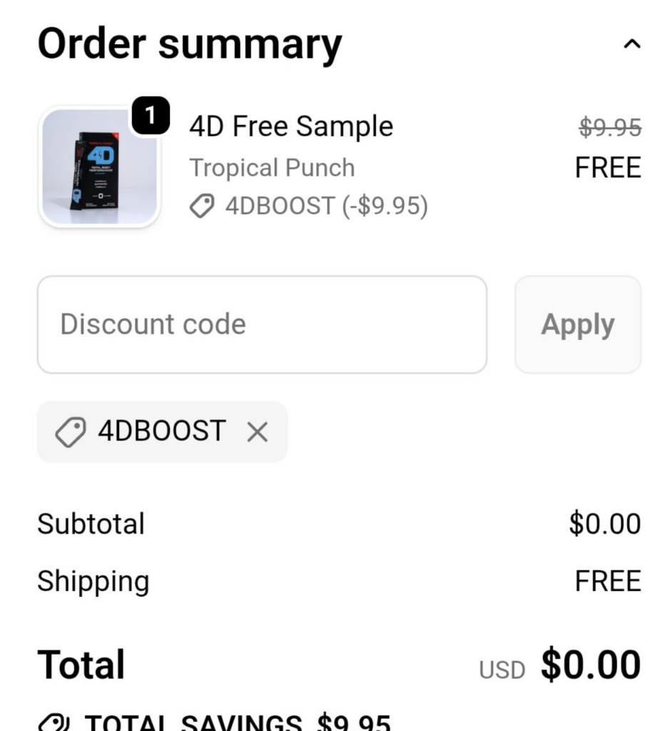 The 4D Free Sample allows you to receive a single sample pack of their performance drink mix. Normally priced at $9.95, the sample becomes free when you apply the code 4DBOOST at checkout. Shipping eligibility is limited to U.S. addresses, and the offer is capped at one sample per household.