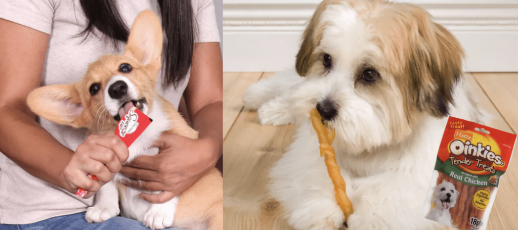 Hartz Oinkies Tender Treats provide fun and tender chewing entertainment with the irresistible flavor of chicken your dog will crave. They’re perfect for senior dogs with sensitive teeth and smaller dogs with little mouths. These treats are made with real chicken and are grain-free with no added fillers or by-products, no artificial colors, and no added preservatives. They come in a variety of sizes to fit your dog’s mouth.