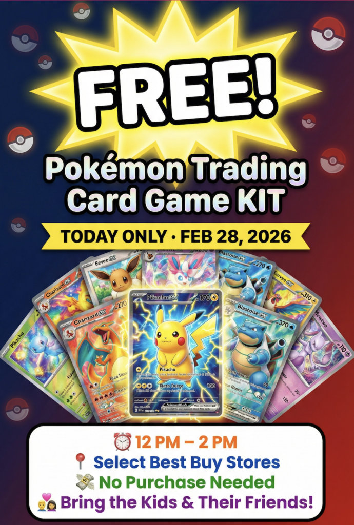 “Get a free trading kit when you bring your kids and their friends to select Best Buy stores on 2/28/26 from noon to 2 p.m. to learn about the Pokémon Trading Card Game. Plus, play, trade, and share some of your favorite Pokémon with other trainers.”