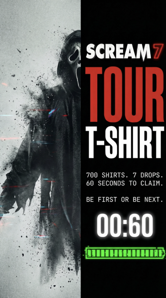 Open to US residents aged 18 and older. Void where prohibited. No purchase required. Odds of receiving a shirt depend on response speed and total entries per window. Shirts are official Scream 7 Kill Tour merchandise provided by Paramount. Terms apply.