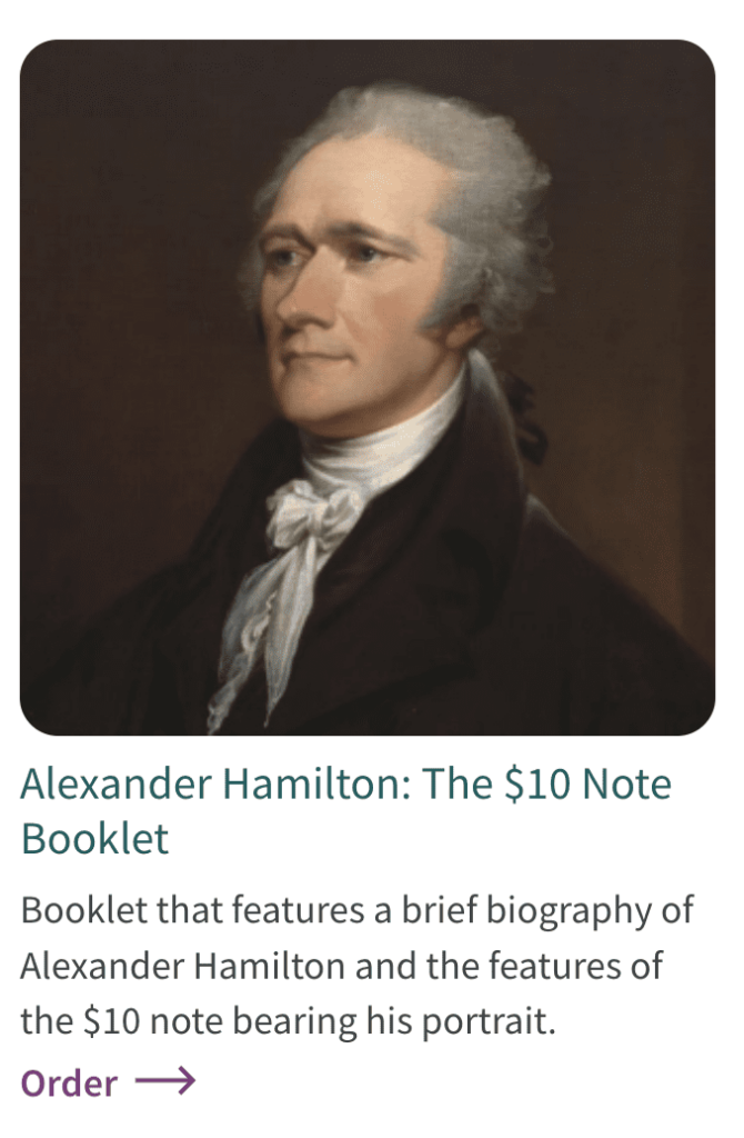 - Alexander Hamilton: The $10 Note Booklet – Booklet that features a brief biography of Alexander Hamilton and the features of the $10 note bearing his portrait.