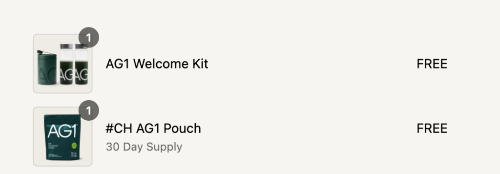 - Go to the AG1 cart page – it should already be added at no cost.