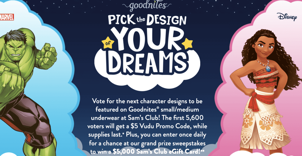 The Goodnites Pick the Design of Your Dreams Giveaway offers a total of 5,600 giveaway prizes. Each giveaway prize consists of a Vudu Promotional Code worth $5, redeemable for the purchase or rental of content from a curated list of Disney and Disney Pixar titles on Vudu.com and participating Vudu apps. It’s important to note that the Vudu Promotional Code must be redeemed by September 30, 2023.