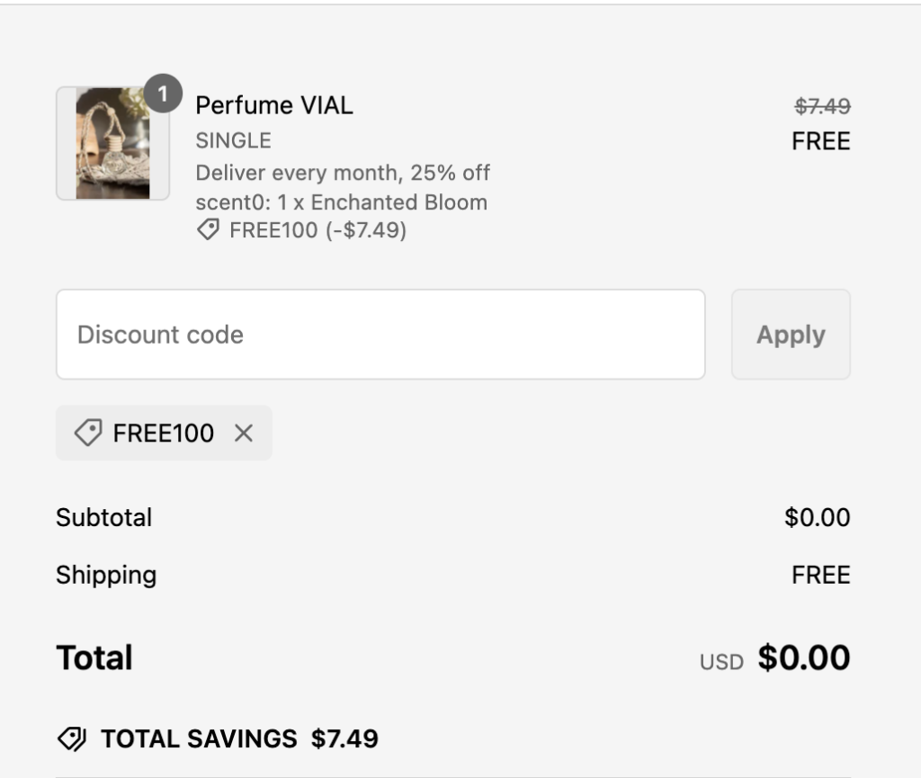 Use code FREE100 at checkout, but you MUST select the subscription option for it to work!