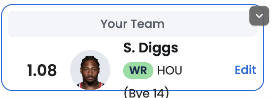 - Click the green plus sign (+) next to Stefon Diggs’ name to add him to your team.