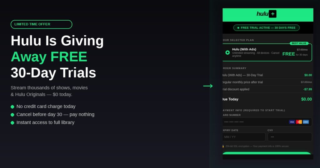 If you have been thinking about trying Hulu, right now is the single best time to act. Hulu is currently offering a free 30-day trial — giving you complete, unrestricted access to thousands of shows, blockbuster movies, and award-winning Hulu Originals for an entire month at absolutely no cost. Spots are limited, and this deal closes the moment the cap is reached, so reading this page means the window is still open for you.