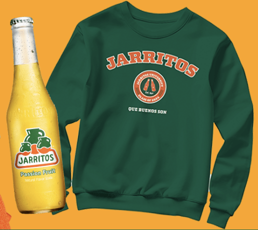 - Twelve (12) Grand Prizes: One (1) Jarritos Passion Fruit 12-pack and One (1) Limited Edition Jarritos Varsity Sweatshirt (Total ARV: $50.00)