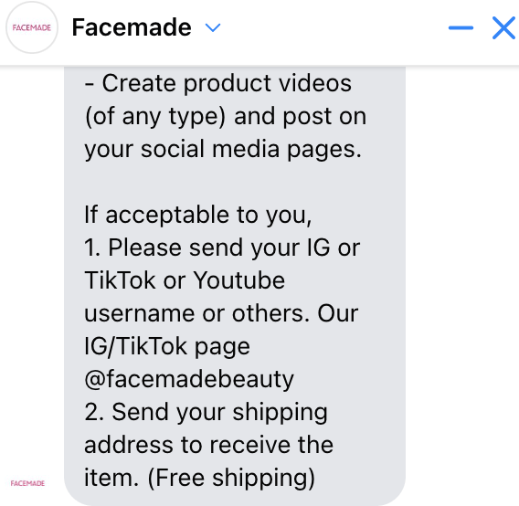 Go here and message them on Facebook and ask “How to join the influencer program?” they should reply back asking you to send over your IG or TikTok or Youtube username and to Send your shipping address to receive the item (Free shipping). It might take some time to receive your reply, maybe even a few hours or longer since so many will be messaging them.