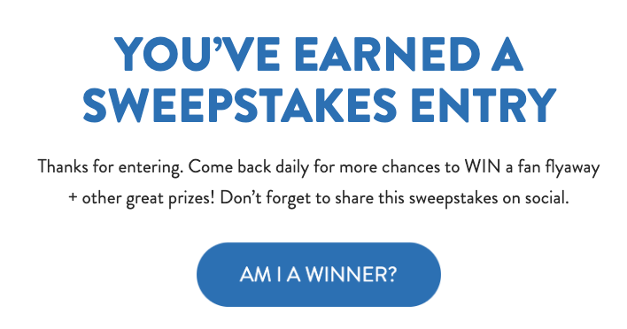 After completing registration on the Promotion Site, you’ll immediately find out if you’re a potential winner of an Instant Win Prize. If luck is on your side, you’ll receive an on-screen notification and an email confirmation within one (1) to two (2) days. But don’t worry, even if you don’t win instantly, you’ll still be entered into the Sweepstakes for a chance to win even bigger prizes.