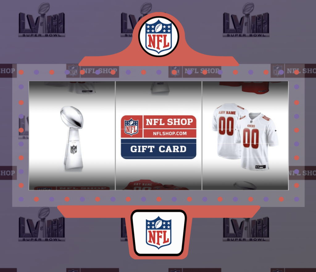 - First Prizes: Five (5) winners will each receive a $100 NFLShop.com gift card. Although it may not be as substantial as the Grand Prize, this gift card still presents a fantastic chance to enhance your NFL collection. Use it to snag that jersey you’ve been eyeing or grab some new gear to show off your team spirit.