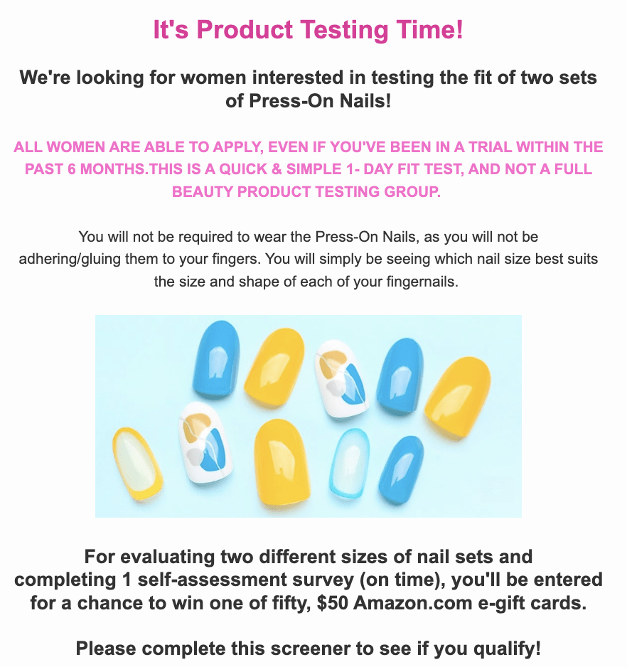 To participate in this exciting opportunity, you’ll need to complete a screener to see if you qualify. After evaluating two different sizes of nail sets and completing one self-assessment survey on time, you’ll be entered for a chance to win one of fifty $50 Amazon.com e-gift cards.