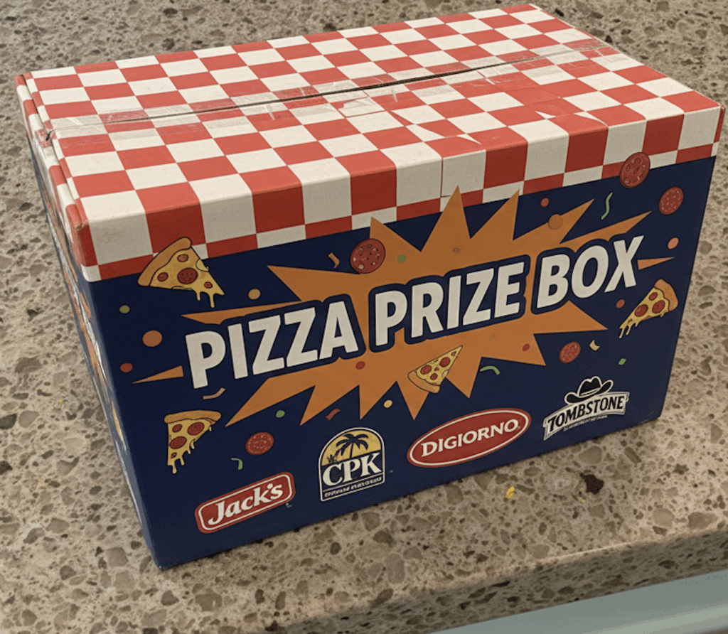 - Each receives a $280 value pizza package including: 4 Jack’s, 2 CPK, 2 DiGiorno, 4 Tombstone coupons + Pizza Merch Bag.