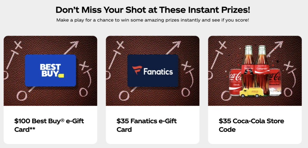 - Game Day: Best Buy, Fanatics, adidas, and Coca-Cola Store e-gift cards.