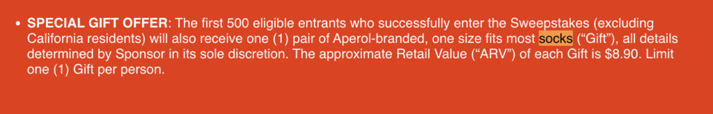 And here’s a special gift offer exclusively for the first 500 eligible entrants (excluding California residents): you’ll receive a pair of Aperol-branded socks! These socks will add a touch of joy and style to your wardrobe, with an approximate retail value of $8.90.