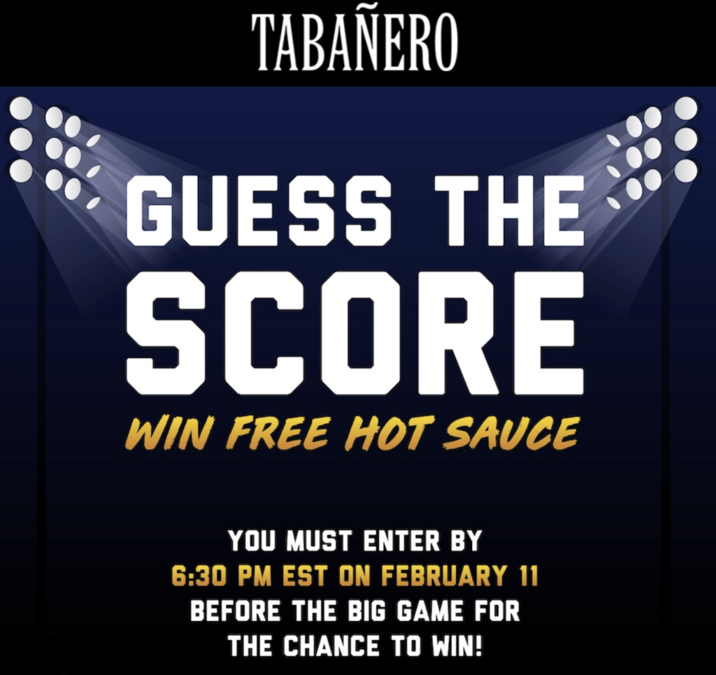 The Tabañero Hot Sauce Guess the Score Sweepstakes is your opportunity to bring home a Tabañero Hot Sauce Variety pack. To enter, all you have to do is guess the final score of the big game. It’s a fun and exciting way to test your sports knowledge while also adding some sizzle to your pantry.