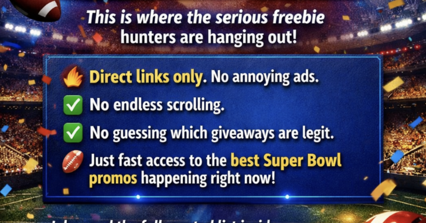 Sweepstakes1 Min Read Freebie MomonFebruary 8, 2026 Super Bowl 2026 Giveaway List Super Bowl 2026 Giveaway Hub Super Bowl 2026 Giveaway Hub This is where the serious freebie hunters are hanging out. Direct links only. No…