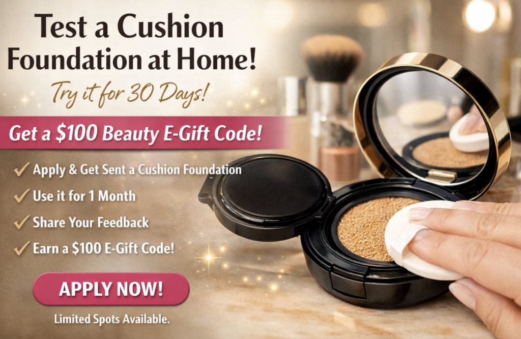 A new at-home beauty testing opportunity is circulating that allows eligible U.S. residents to apply to test a cushion foundation for one full month — and receive a $100 prestige beauty e-gift code for completing a short feedback survey at the end.