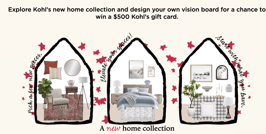 - Instagram Story Share Entries: Share your vision board on your public Instagram story, tagging Kohl’s (@Kohls) and including the hashtag #KohlsHomeSweepstakes in the caption. Each qualifying Instagram story share will earn you ten bonus entries per vision board.
