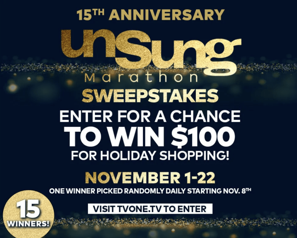 What are you waiting for? The Unsung 15th Anniversary Sweepstakes is waiting for you. Enter now for your chance to be one of the lucky winners to receive a $100 gift card. Whether you use it to treat yourself or spread some holiday cheer, the choice is yours. Remember, you can’t win if you don’t enter, so head over to https://tvone.tv/342463/unsung-15th-anniversary-sweepstakes/ and submit your entry today!