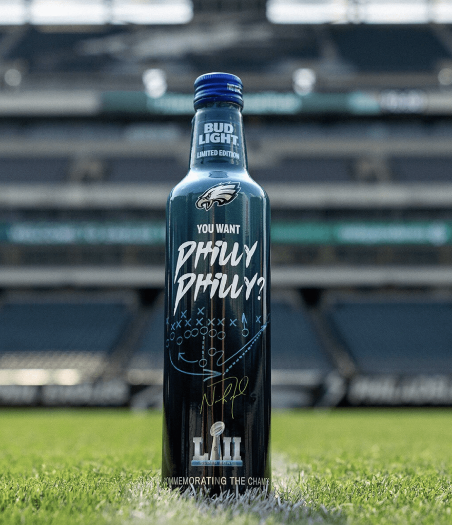 - Bud Light “Philly Philly” Aluminum Bottle & $72 Pre-paid Digital Gift Card: Each winner will receive one Bud Light “Philly Philly” aluminum bottle, commemorating the Philadelphia Eagles’ Super Bowl LII victory. In addition, you’ll get a $72 pre-paid digital gift card, which you can use to purchase two 24-packs of Bud Light or any other product permissible under the gift card’s terms. Note: The aluminum bottle is empty and does not contain alcohol. Alcoholic beverages are not part of the prize. The Approximate Retail Value (ARV) of each prize is $122.