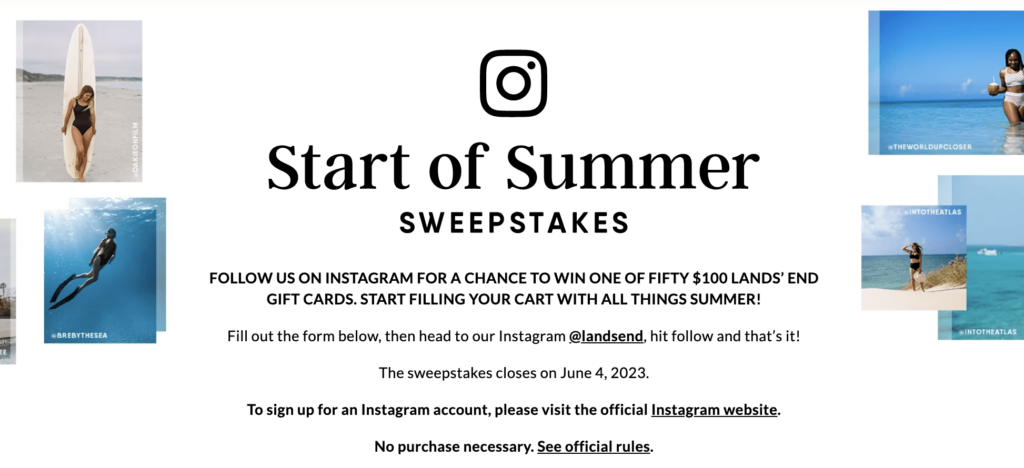 The Lands’ End Start of Summer Sweepstakes runs from May 20, 2023, to June 4, 2023, 11:59 pm CT, giving you ample time to participate and secure your chance of winning. To be eligible, you must be a legal resident of the fifty United States and the District of Columbia and be over the age of majority in your jurisdiction of residence at the time of entry. Additionally, you must be a registered user of instagram.com, with an active and, if applicable, public account from the time of entry until the end of the Promotion Period. This exciting opportunity is available to individuals who meet these eligibility requirements, so get ready to dive into the sweepstakes and make this summer one to remember.