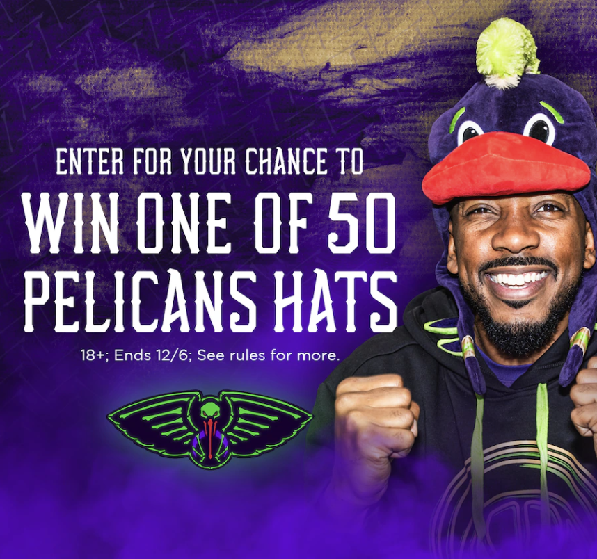 - 50 Grand Prizes: Each winner will receive one (1) Pelicans Plush Hat (Approximate Retail Value: $25). These limited-edition hats are the perfect accessory to showcase your team pride, whether at home or courtside.