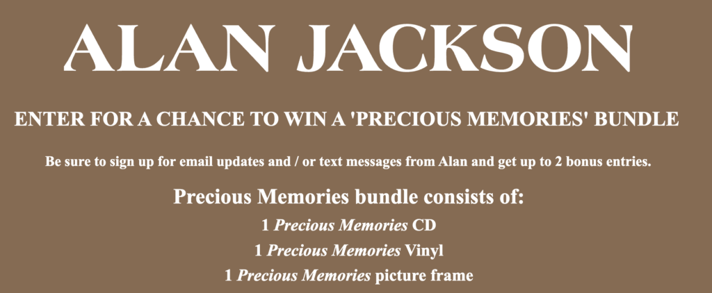 One-time entry. Earn up to 2 bonus entries by opting into Alan Jackson’s email and/or SMS updates.