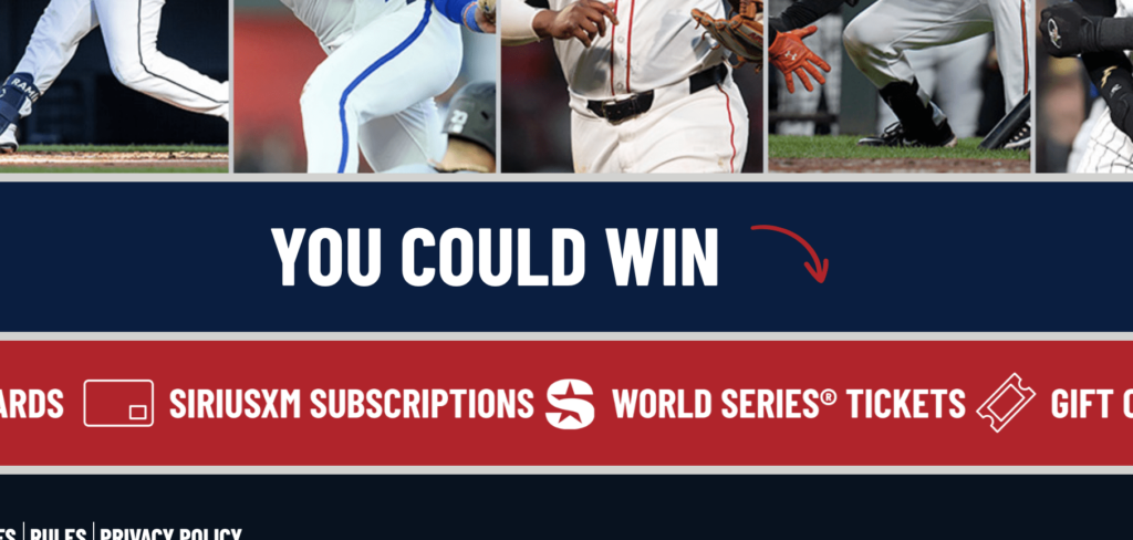 - Instant Win Prizes: MLB.tv Subscription, SiriusXM Subscription Gift Card, $10 E-Gift Card, $100 MLBShop.com Gift Card, $50 MLBShop.com Gift Card, $30 MLBShop.com Gift Card