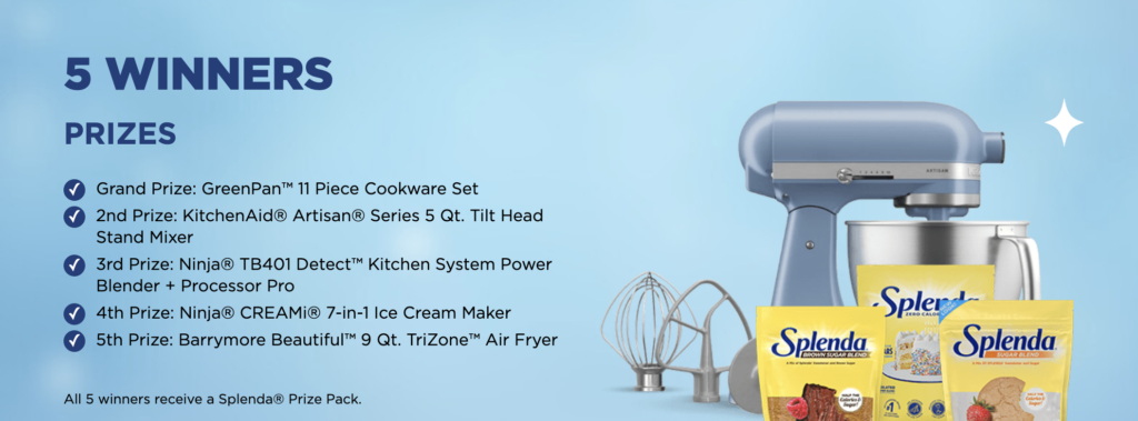 - Second Prize: KitchenAid® Artisan Stand Mixer + Splenda Prize Pack (ARV: $409.99)