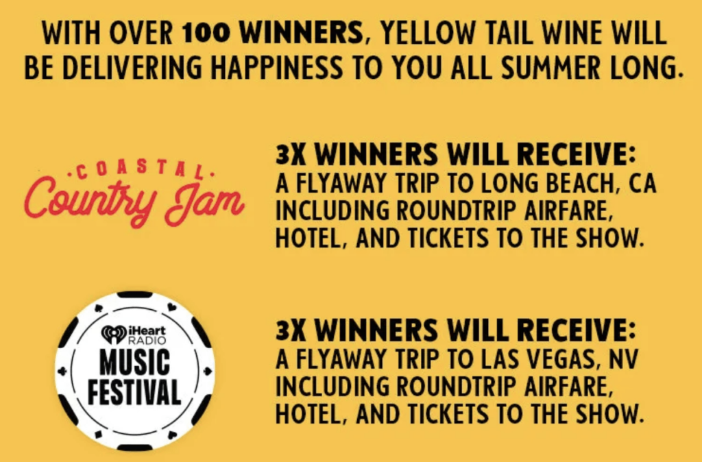 Please note that all prizes are provided by iHeartMedia + Entertainment, Inc. and Yellow Tail. The Sponsor reserves the right to substitute the prize (or a component thereof) for one of equal or greater value if the designated prize becomes unavailable for any reason. In lieu of the grand prize trip, winners will have the option to receive $5,000 in cash.