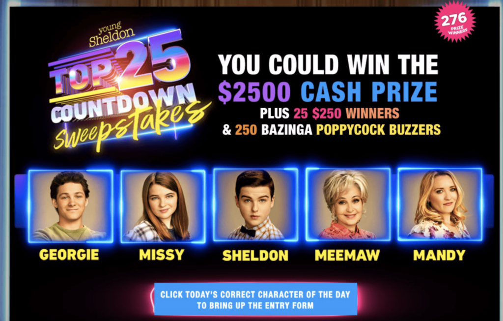Are you ready to add excitement to your daily routine? The YOUNG SHELDON Top 25 Countdown Sweepstakes is your chance to win fabulous prizes just by tuning into your favorite show. With a grand prize of $2,500 and hundreds of other prizes, don’t miss out on this amazing opportunity!